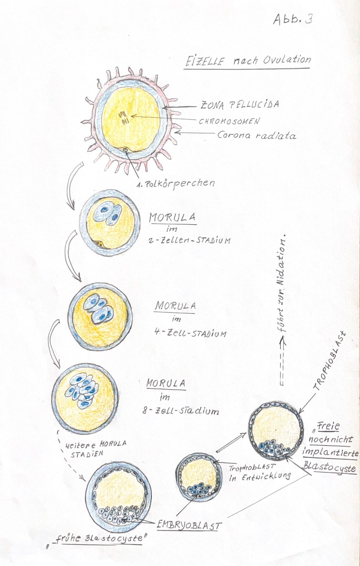 9. In der Blastocyste entsteht durch Wachstum und Zellteilung der sog. Embryoblast mit den ersten spezialisierten Zellen, die den Trophoblasten entwickeln. Der Trophoblast ist eine Zellschicht welche die Nidation = die Anheftung der Blastozyten in der mütterlichen Uterusschleimhaut bewältigen muss.