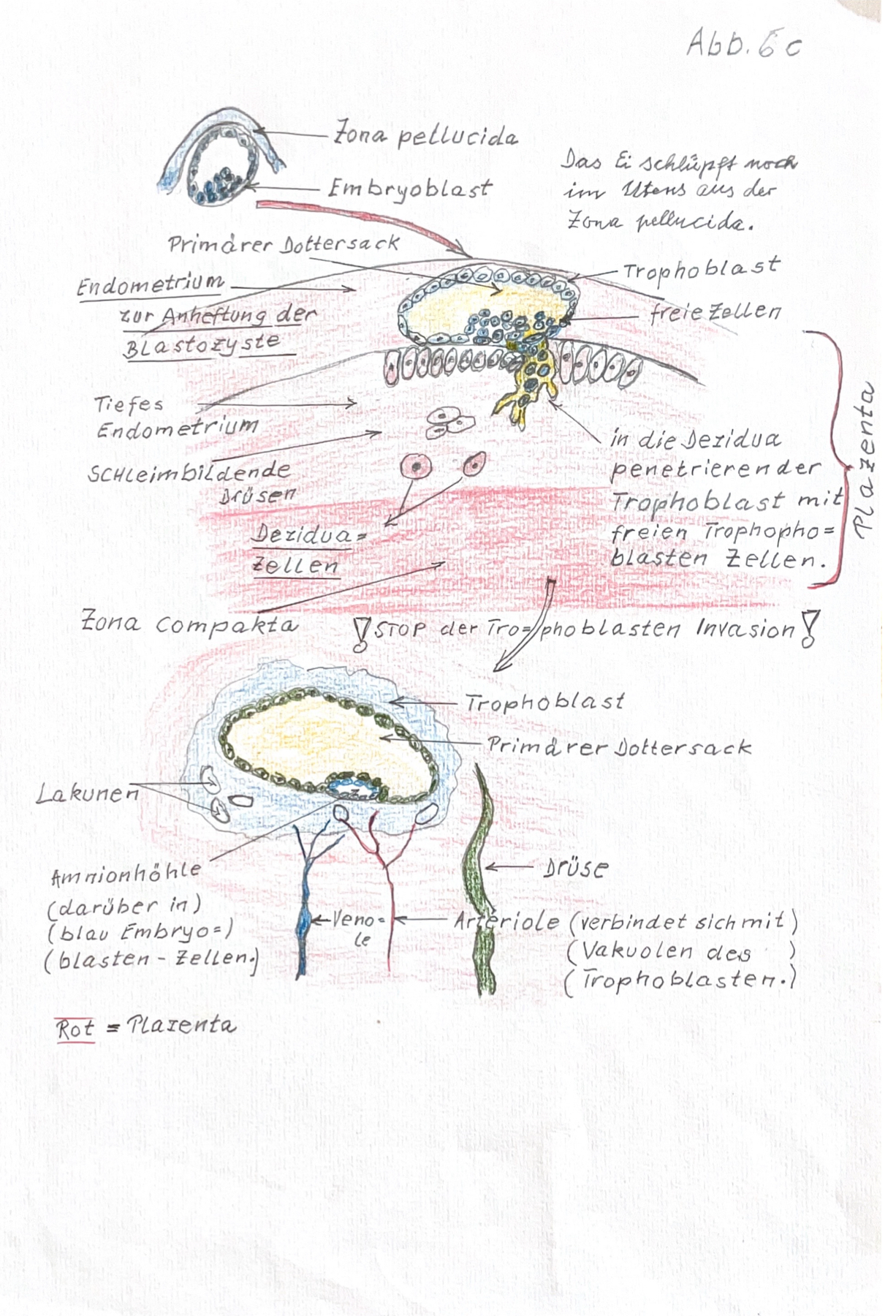 11. Zugleich sorgt der Trophoblast dafür, das die mütterliche Uterusschleimhaut zu einer Dezidua = zur späteren Plazenta umgewandelt wird.