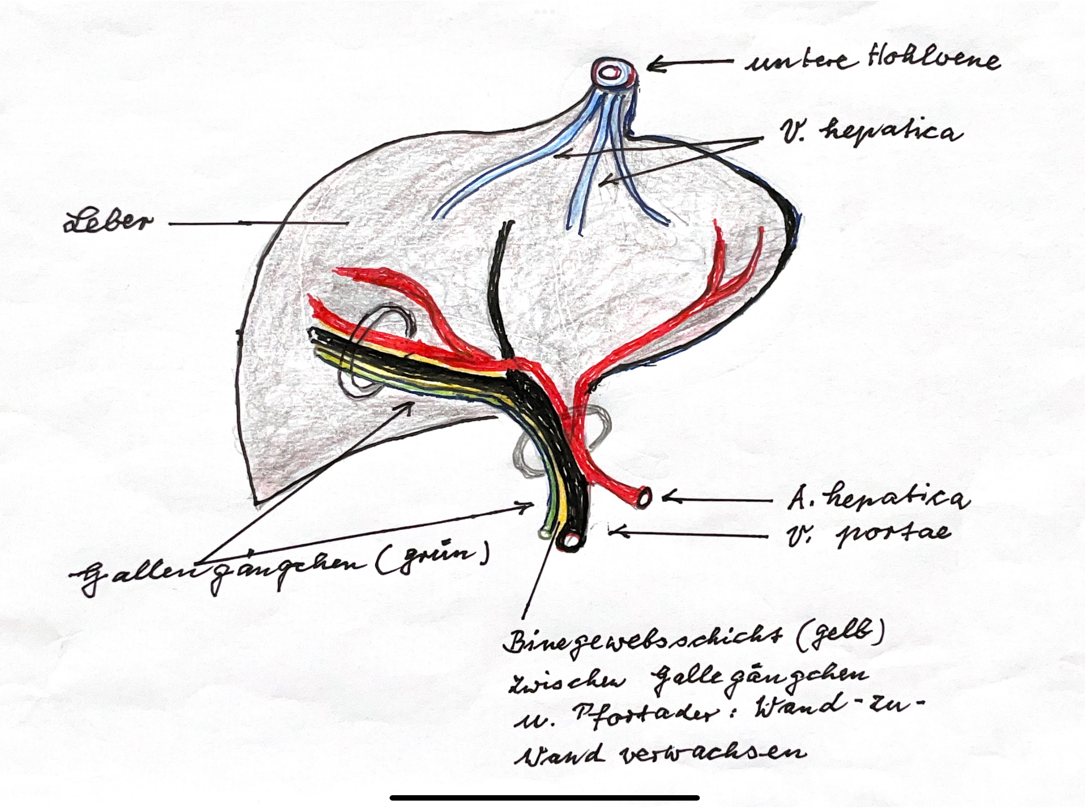 ((Abb.2) Sie zeigt schematisch die Konfluenz der Pfortader im Eintritt in die Leber und den gegenläufigen, normalen Verlauf der intrahepatischen Gallengängchen entlang den beiden Pfortaderästen: (Pfortader: violett, Gallengängchen: grün, Bindegewebe: gelb). Solche intrahepatischen Gallengängchen sind, (sofern sie überhaupt vorhanden sind), fest mit der gegenläufig verlaufenden Wand der Pfortader verbunden.)