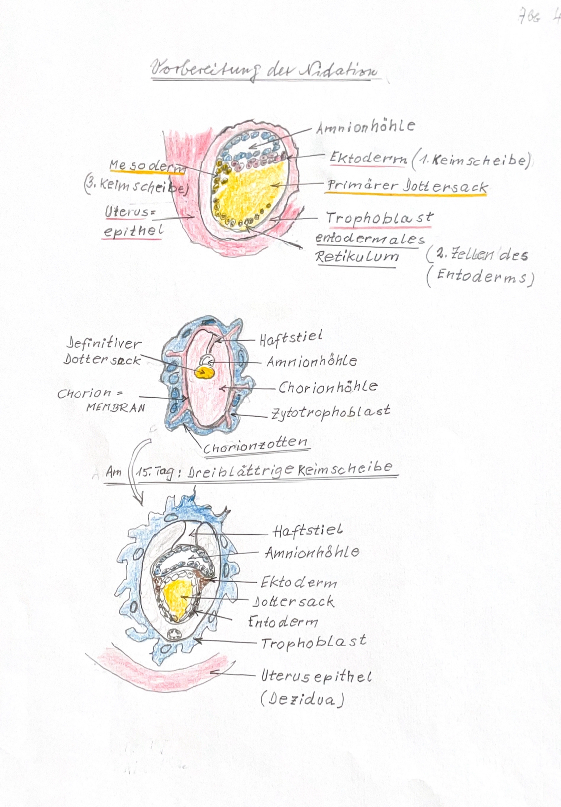 10. Am 15. Tag nach der Befruchtung entsteht in einem Holraum der Blastzyste eine Zelldifferenzierung in drei sog. Keimblätter: das Ektoderm, dass Mesoderm und das Entoderm statt.