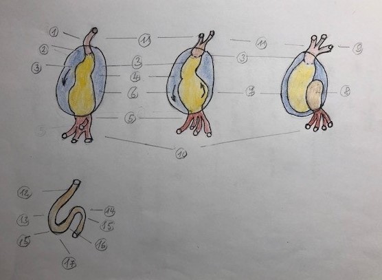 Nach dem Studium dieser Bücher der Embryologie und der Fehlbildungen ergänzte unser Vater sein bereits als Student begonnenes Heft über Embryologie und verfasste damit ein neues Manuskript mit vielen Abbildungen (Abb. 8). In dieses neue Manuskript fügte er laufend Berichte über die Anatomie von Fehlbildungen ein, die er als Operateur erfahren hat. Dieses Manuskript übergab er bei seiner Emeritierung 2002 mit dem Universitätsstempel versehen der Bücherei der Chirurgischen Klinik. Es trug den Titel: Manuskript über Embryologie und Fehlbildungen, für Studierende der Medizin in Tübingen. (Mit Bedauern musste jedoch schon 2019 festgestellt werden, dass dieses Manuskript nicht mehr im Bücherregal der Chirurgie steht. Trotz Recherchen durch die Klinikverwaltung ist es nicht mehr auffindbar.) Ein paar Skizzen, die er damals für eine Vorlesung anfertigte, demonstriert die (Abb. 8). Es sind Zeichnungen, die er für ein Seminar anfertigte und zu einem Manuskript verarbeitete.
