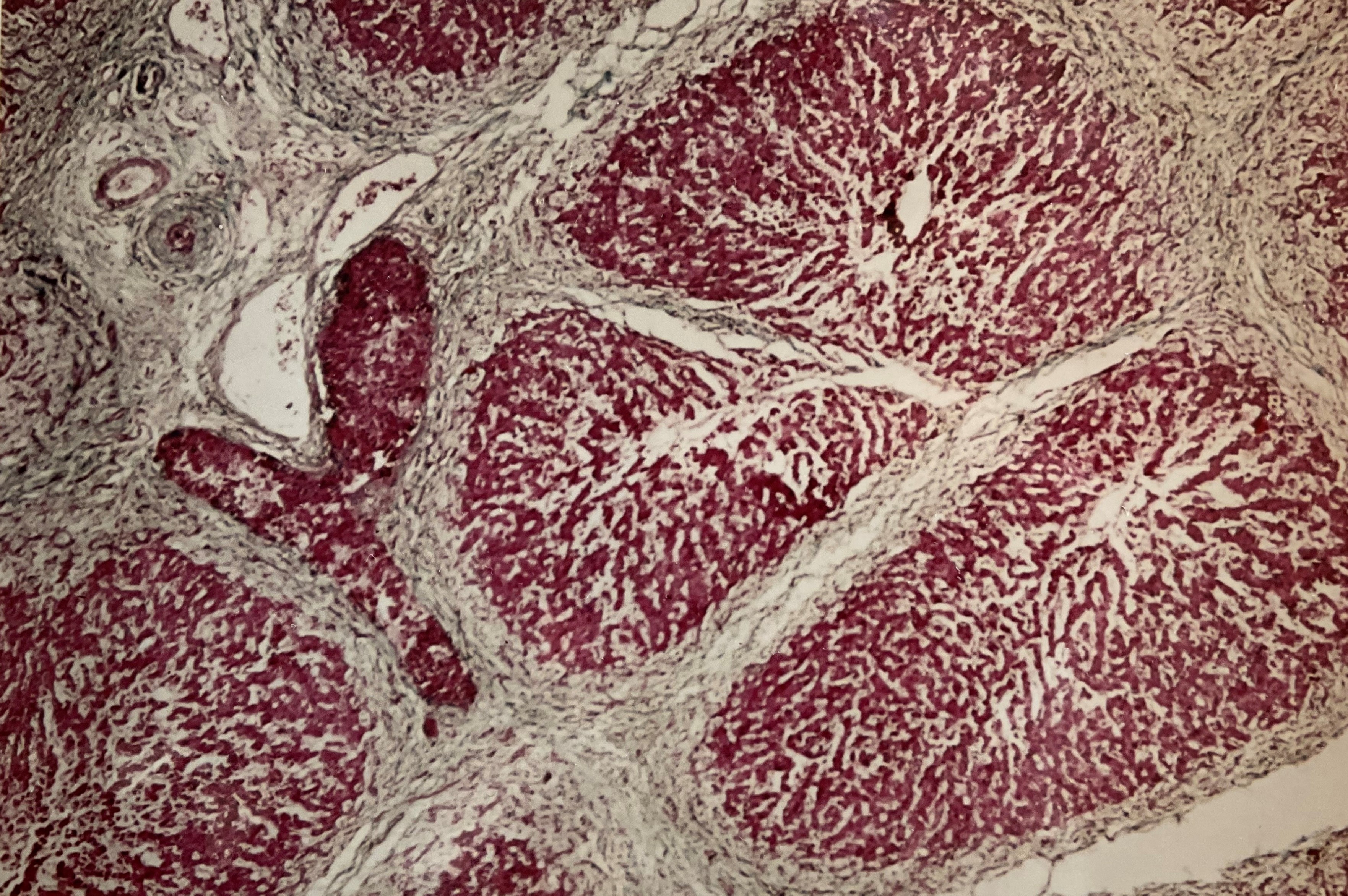 Extendit-Hepatoporto-Enterostomie: Das gelbgefärbte Bindegewebe fixiert die Wand von intraheatischen Gallengängchen fest auf der Wand des intraheptischen Anteils der Pfortader. Bei einer Extra-Hepatischen Gallengangsatresie