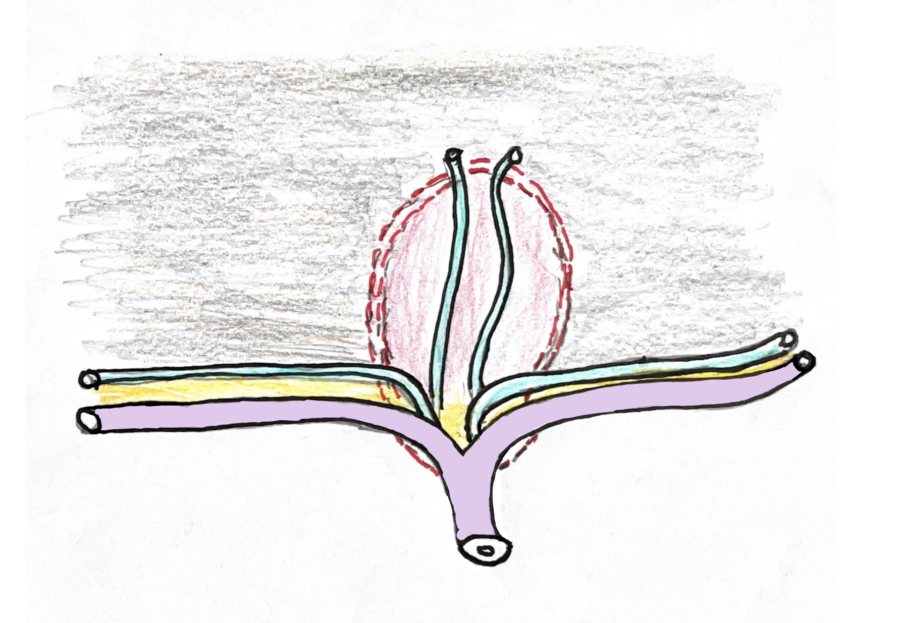 (siehe: rotgestrichelte Linie). Die Präparation zur Erkennung von Gallengängchen